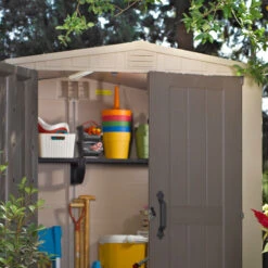 Grâce à sa belle double porte menuisière, vous pourrez accéder facilement à l’intérieur de l’abri et pourrez faire rentrer de belles pièces de mobilier, même volumineuses. La porte est dotée d’une jolie poignée à serrure pour sécuriser l’accès. Les 2 fenêtres ouvrantes en verre, en façade, apportent de la luminosité dans l’abri de jardin.