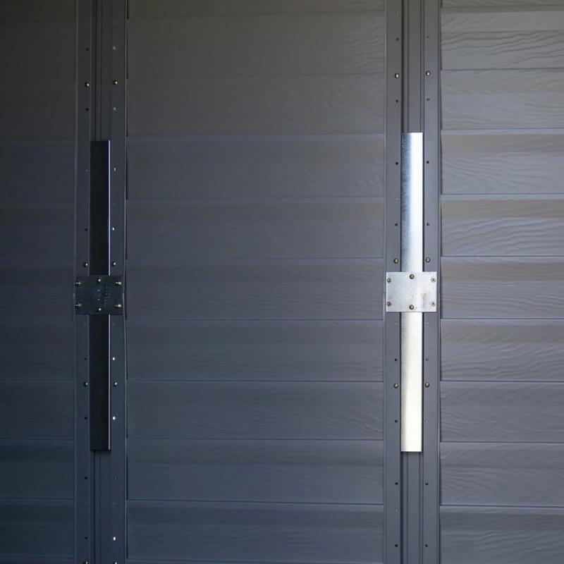 La structure est renforcée au moyen de raccords métalliques reliant les panneaux entre eux. Les tôles gris anthracite des parois ont une texture imitant le bois et sont conçues pour résister durablement aux intempéries ainsi qu’à la corrosion, avec une garantie de 12 ans. La toiture peut supporter une charge de neige allant jusqu’à 100kg/m².