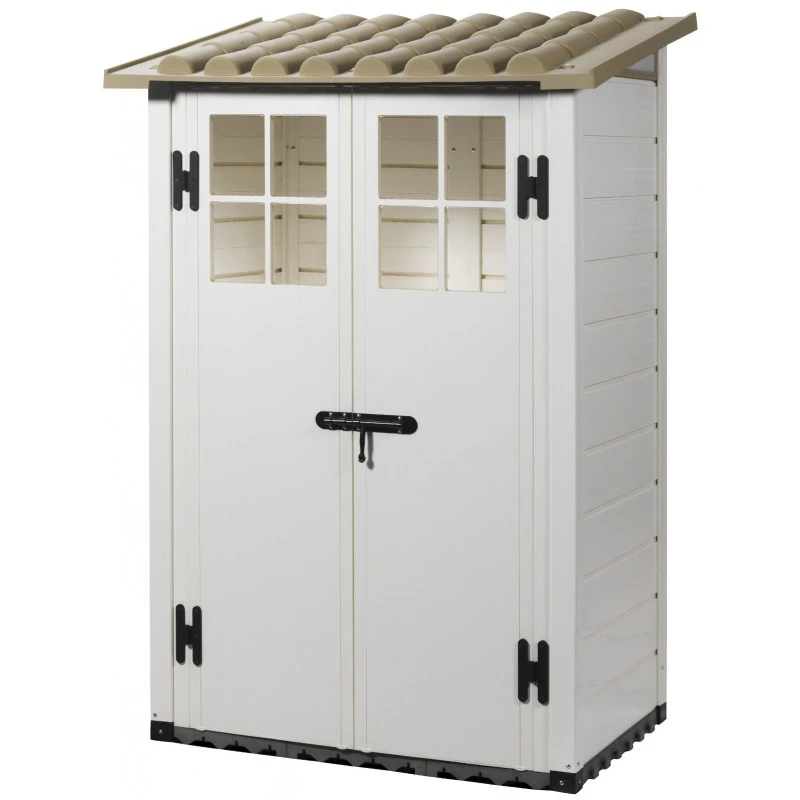 Au sol, un plancher en dalles composites de 45 mm d’épaisseur protège l’abri de jardin de l’humidité, et sert de fondation. Les parois en résine de PVC extrudée sont alvéolaires, et structurellement rigides et résistantes, avec une épaisseur de 22mm.