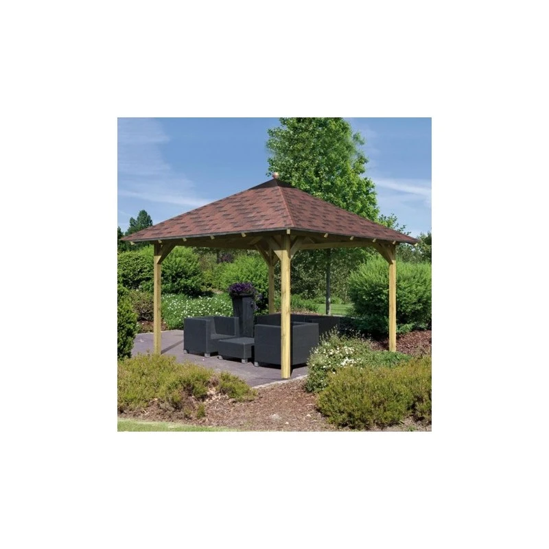L’avis du spécialiste sur le kiosque carré en pin massif Granada – 3,77×3,77m – Karibu