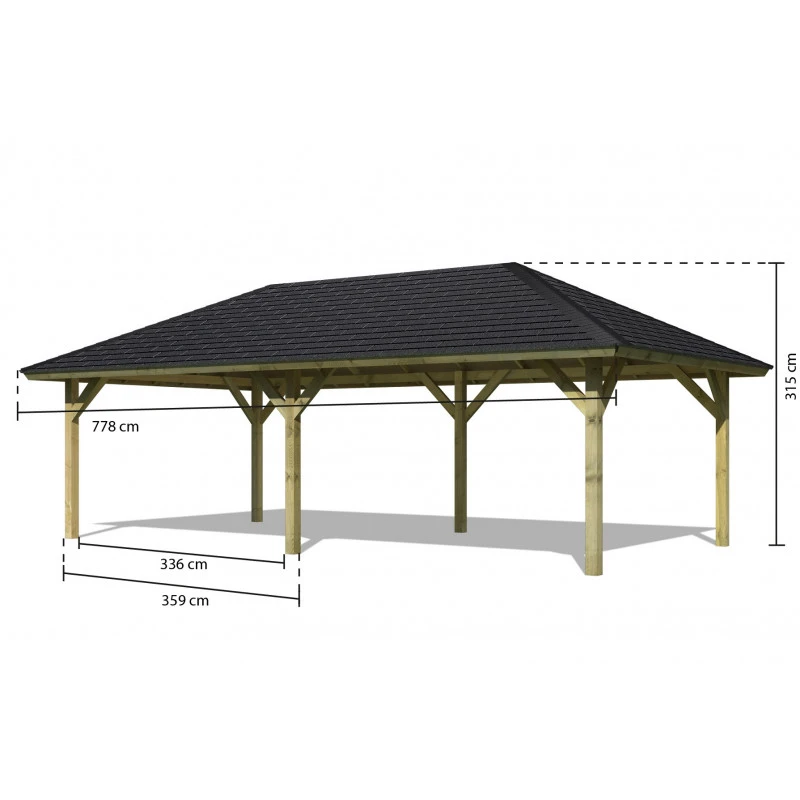 Le pavillon en bois massif Holm 2 est constitué de 6 robustes poteaux de sections 12x12cm surplombés d’une généreuse toiture de plus de 33m² de couverture !