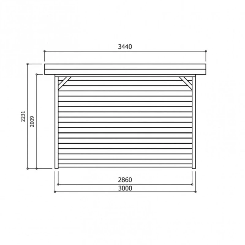 Ce kiosque de jardin de dimensions 300x200cm est livré avec panneaux pré-montés et un recouvrement de toiture en feutre bitumeux noir. Sa structure robuste est constituée de poteaux de 7x7cm de section d’une hauteur de 201cm. Au niveau de la jonction avec la charpente de la toiture, des éléments de renfort en bois assurent une stabilité structurelle optimale. Le toit plat possède une hauteur faîtière de 223cm.