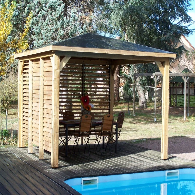 . Parois : 2 parois avec ventelles mobiles orientables en bois thermo traité 20x95cm pour répondre aux différentes conditions climatiques, les 2 parois à ventelles peuvent être fixées sur n’importe quel côté